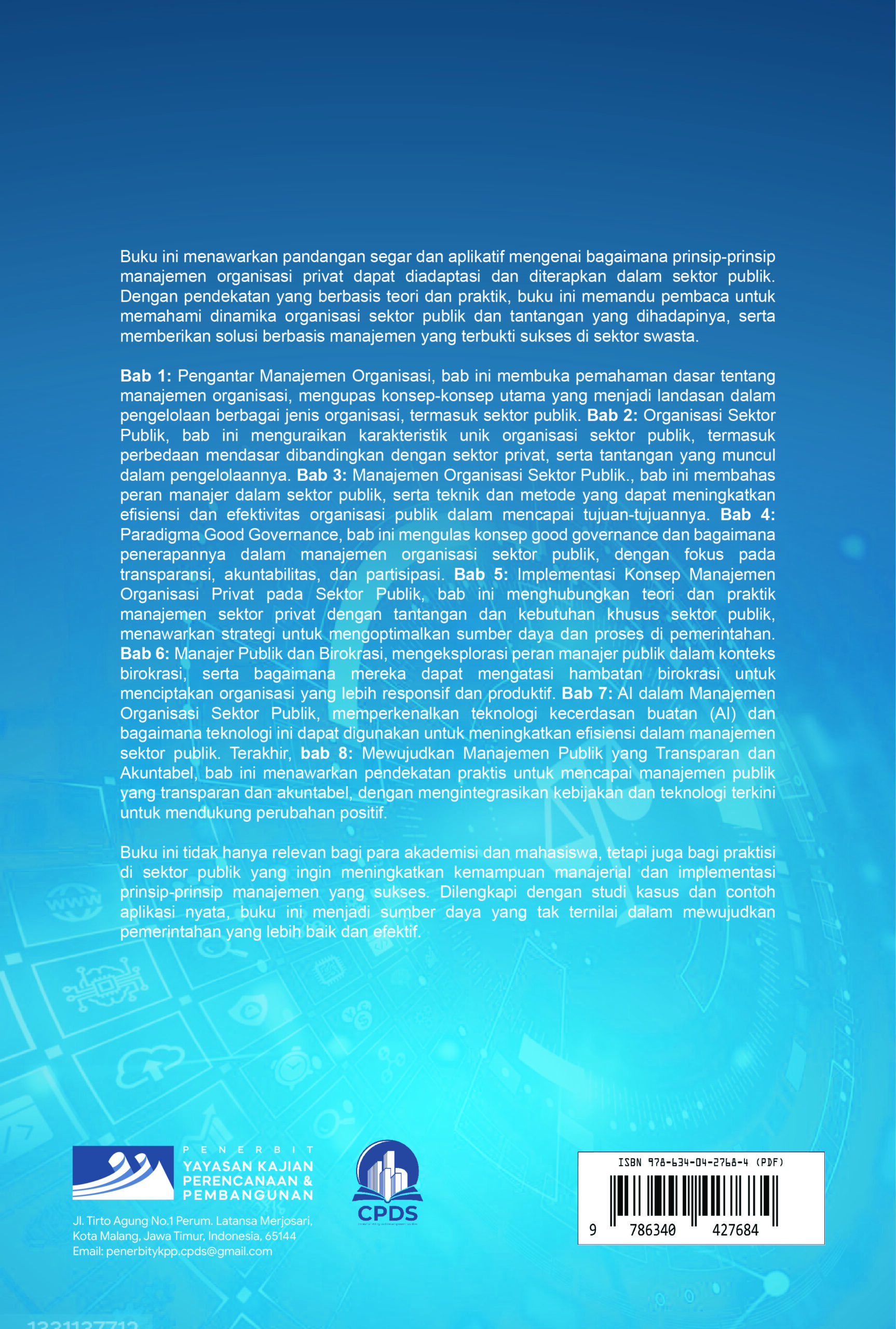 Bab 1: Pengantar Manajemen Organisasi, bab ini membuka pemahaman dasar tentangmanajemen organisasi, mengupas konsep-konsep utama yang menjadi landasan dalampengelolaan berbagai jenis organisasi, termasuk sektor publik. Bab 2: Organisasi SektorPublik, bab ini menguraikan karakteristik unik organisasi sektor publik, termasuk perbedaanmendasar dibandingkan dengan sektor privat, serta tantangan yang muncul dalampengelolaannya. Bab 3: Manajemen Organisasi Sektor Publik., bab ini membahas peranmanajer dalam sektor publik, serta teknik dan metode yang dapat meningkatkan efisiensi dan efektivitas organisasi publik dalam mencapai tujuan-tujuannya. Bab 4: Paradigma Good Governance, bab ini mengulas konsep good governance dan bagaimana penerapannya dalammanajemen organisasi sektor publik, dengan fokus pada transparansi, akuntabilitas, dan partisipasi. Bab 5: Implementasi Konsep Manajemen Organisasi Privat pada Sektor Publik,bab ini menghubungkan teori dan praktik manajemen sektor privat dengan tantangan dan kebutuhan khusus sektor publik, menawarkan strategi untuk mengoptimalkan sumber dayadan proses di pemerintahan. Bab 6: Manajer Publik dan Birokrasi, mengeksplorasi peranmanajer publik dalam konteks birokrasi, serta bagaimana mereka dapat mengatasi hambatanbirokrasi untuk menciptakan organisasi yang lebih responsif dan produktif. Bab 7: AI dalamManajemen Organisasi Sektor Publik, memperkenalkan teknologi kecerdasan buatan (AI) dan bagaimana teknologi ini dapat digunakan untuk meningkatkan efisiensi dalammanajemen sektor publik. Terakhir, bab 8: Mewujudkan Manajemen Publik yang Transparandan Akuntabel, bab ini menawarkan pendekatan praktis untuk mencapai manajemen publikyang transparan dan akuntabel, dengan mengintegrasikan kebijakan dan teknologi terkiniuntuk mendukung perubahan positif.